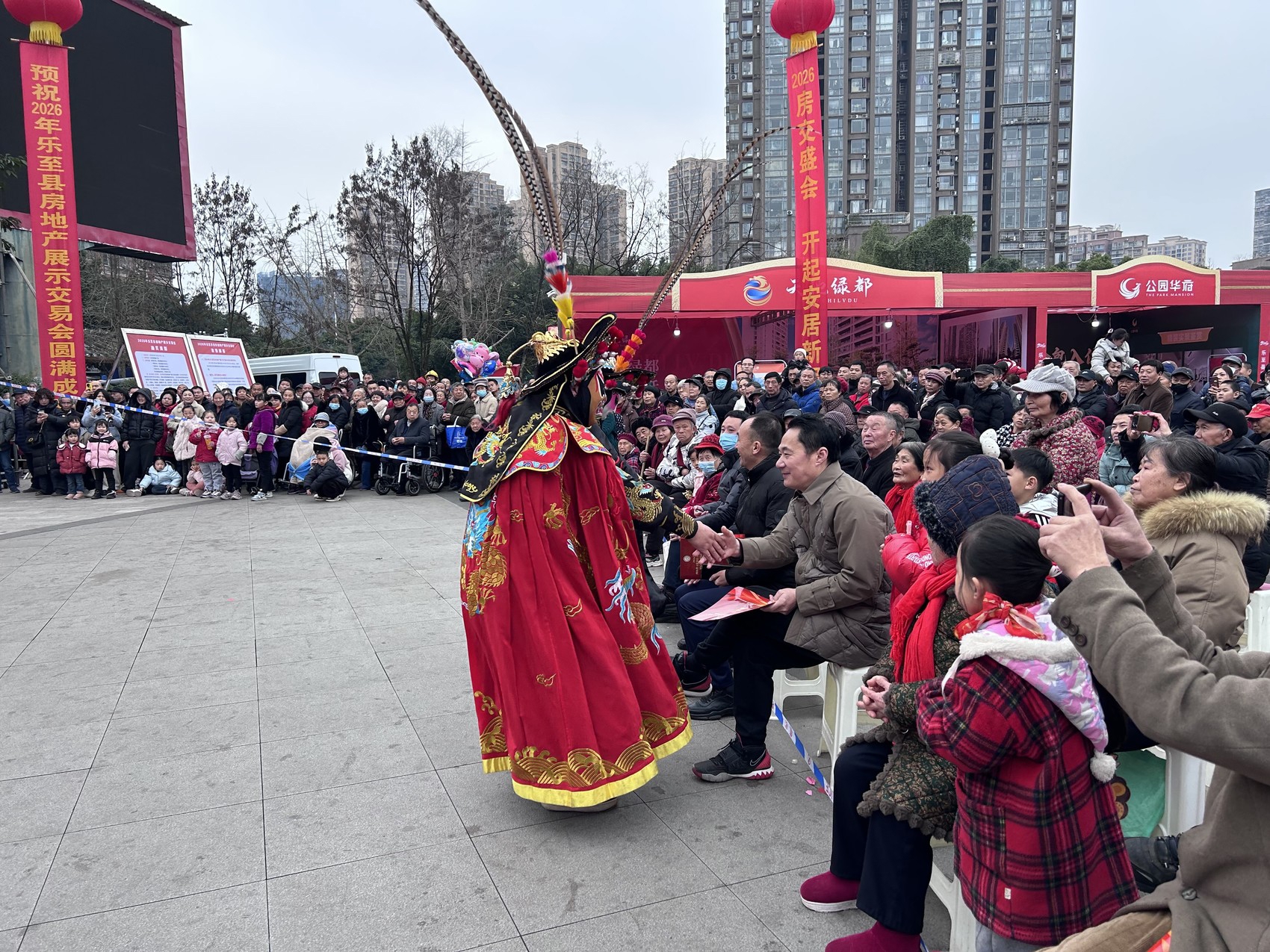 在雁江区市民广场的活动现场,舞台两侧的特色展位“烟火气”十足。东峰剪纸、安岳竹编等本地非遗代表性项目集中亮相,手工艺人现场展演,不少群众驻足体验。“‘抢了’一个福字,过一个幸福年!”刘蓉阿姨拿着墨迹未干的书法作品,脸上满是笑意。
