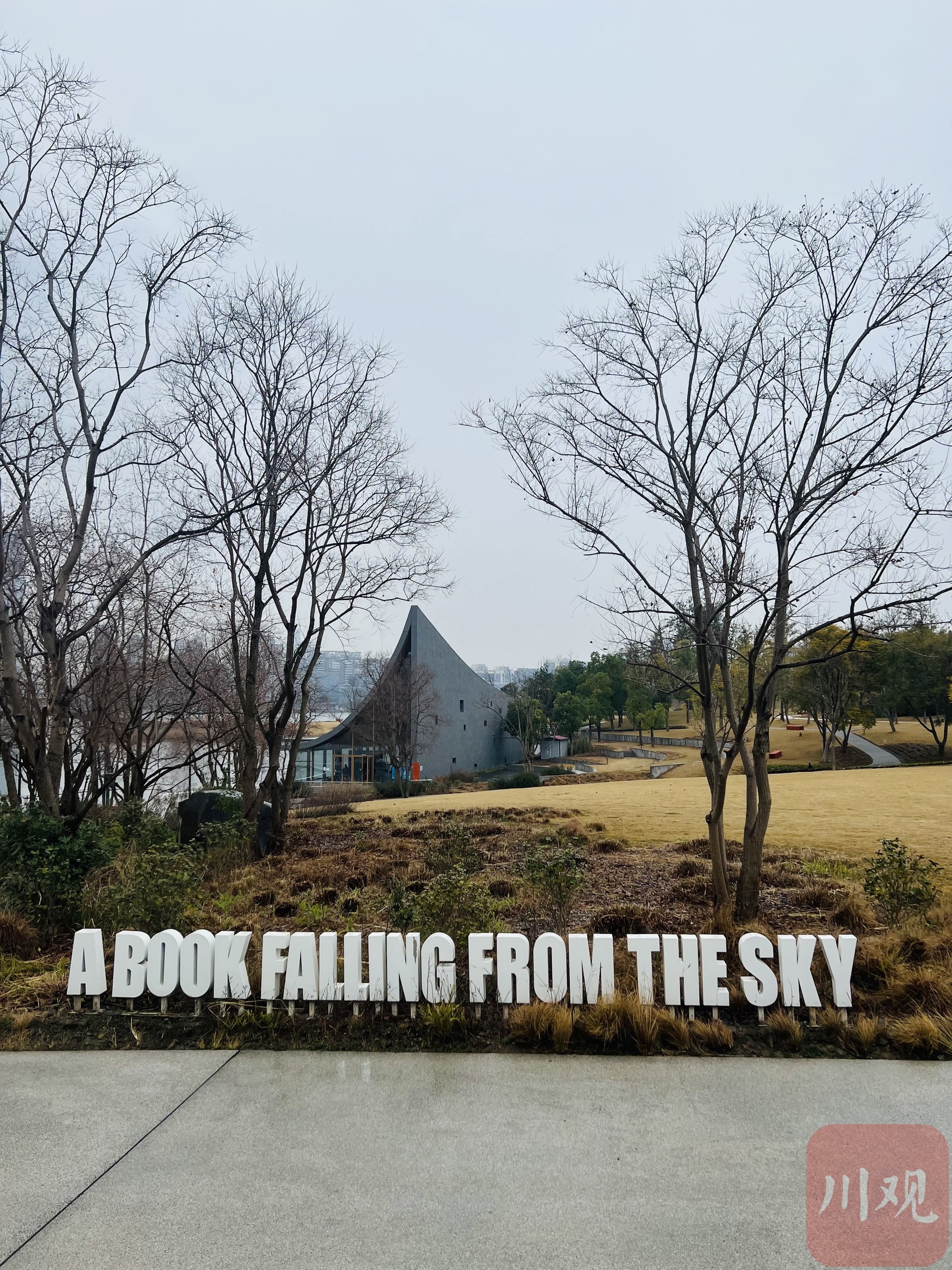当天下午1时45分,记者沿湖岸走近书店,草坪上“A BOOK FALLING FROM THE SKY”的白色标识牌仍醒目立着,这是书店“一本书,从天上掉落在兴隆湖畔”设计理念的英文注解。大门外的橙色导览牌上,弧形屋面如书页的设计故事依旧清晰,而玻璃门上,张贴着“因运营调整,2月9日正式闭店”的通知。