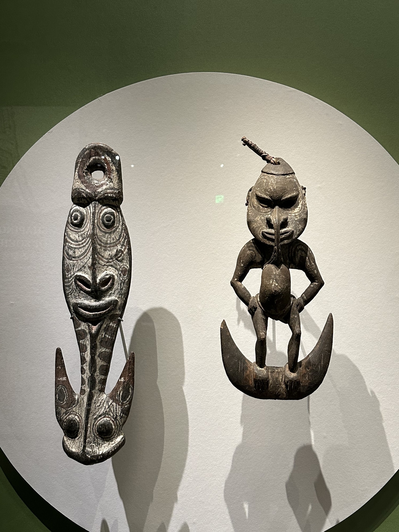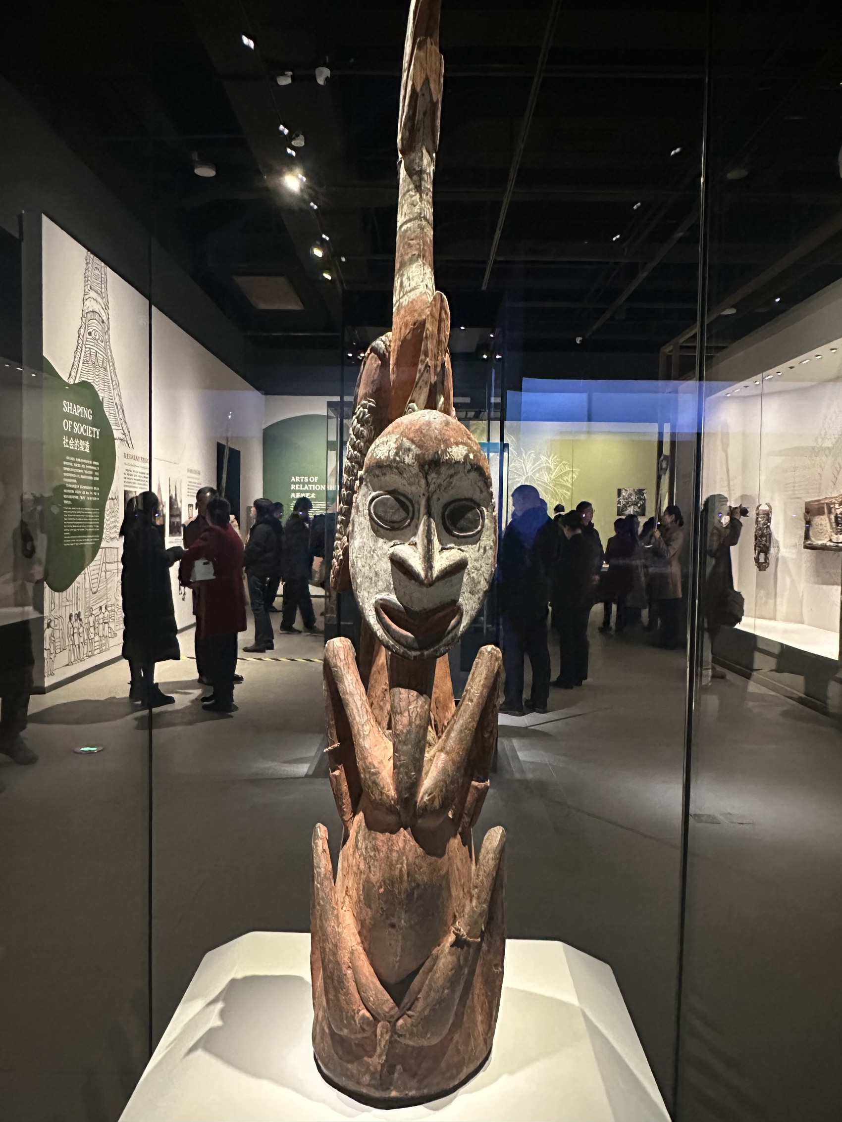 此次“碧海浮槎——法国国家凯布朗利博物馆藏大洋洲艺术珍品展”在三星堆博物馆的推出,是该展在中国境内巡展的首站,也是三星堆博物馆的首个艺术特展。展览以大洋洲人群为核心,从水域、空间、时间与人类自我表达四大维度构建叙事脉络,通过“驶向深蓝”“山海烟火”“天海之交”“礁屿凝光”四个层层递进的篇章解码文明脉络。其中“驶向深蓝”回溯先民迁徙定居历程,布展时还特意加入了福建壳丘头遗址出土的陶器形成文化呼应;“山海烟火”聚焦岛民社会生活,呈现艺术与权力交织的独特运行逻辑;“天海之交”探索文化记忆传承,解读艺术连接现世与神灵祖先的精神纽带;“礁屿凝光”则通过装饰器物与当代创作,展现族群身份认同与核心价值的构建过程,让观众在文物线索中读懂太平洋群岛的社会联结与同源特质。