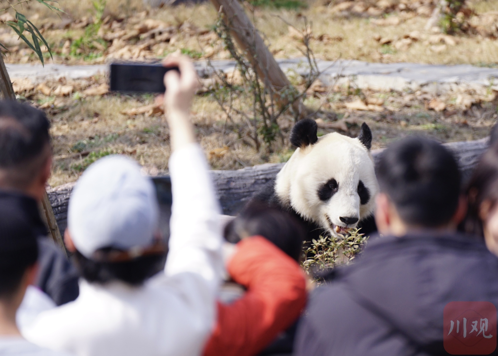 绵阳中华大熊猫苑里,游客们举着相机拍大熊猫。川观新闻资料图