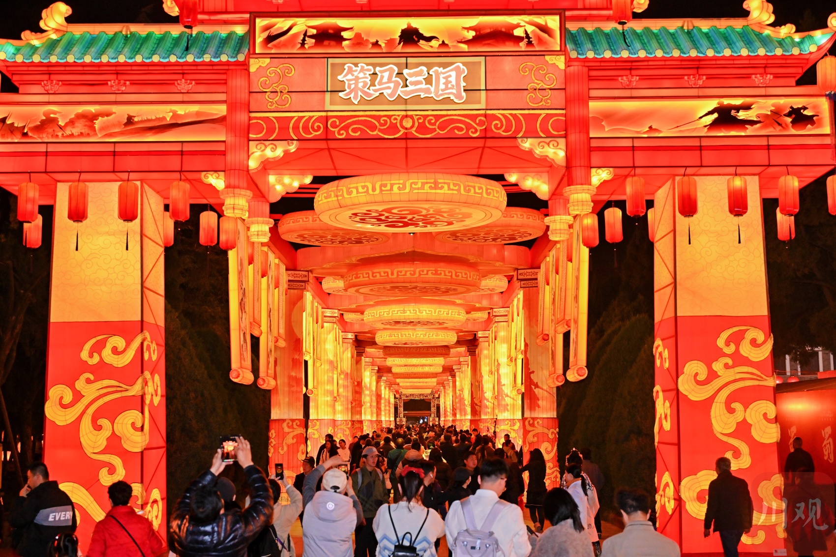 大庙会的主角当属三国主题的灯组。据介绍,本届庙会灯组规模创历届之最,共有16组大型灯组、13组中小型灯组、19处氛围灯组和1.3万盏氛围灯。不仅“君臣之交”巨型灯组以45米长、45米宽、22米高的宏大体量震撼呈现,“三国名驹”灯组非遗糖灯工艺铸就了马的战甲,现场还有践行绿色环保理念的“流光赤焰”灯组,它以2.5万只回收玻璃瓶为原料,经专业消杀处理后,由非遗匠人手工注入色彩、捆扎成型,变废为宝,筑就奔腾骏马。