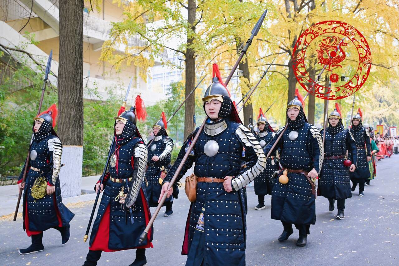 街边游客纷纷举起手机,记录下这道亮丽风景。有人问:“这是明制还是唐制?”小朋友拽着妈妈衣角:“妈妈,那个姐姐像仙女,我也要跟着走。”