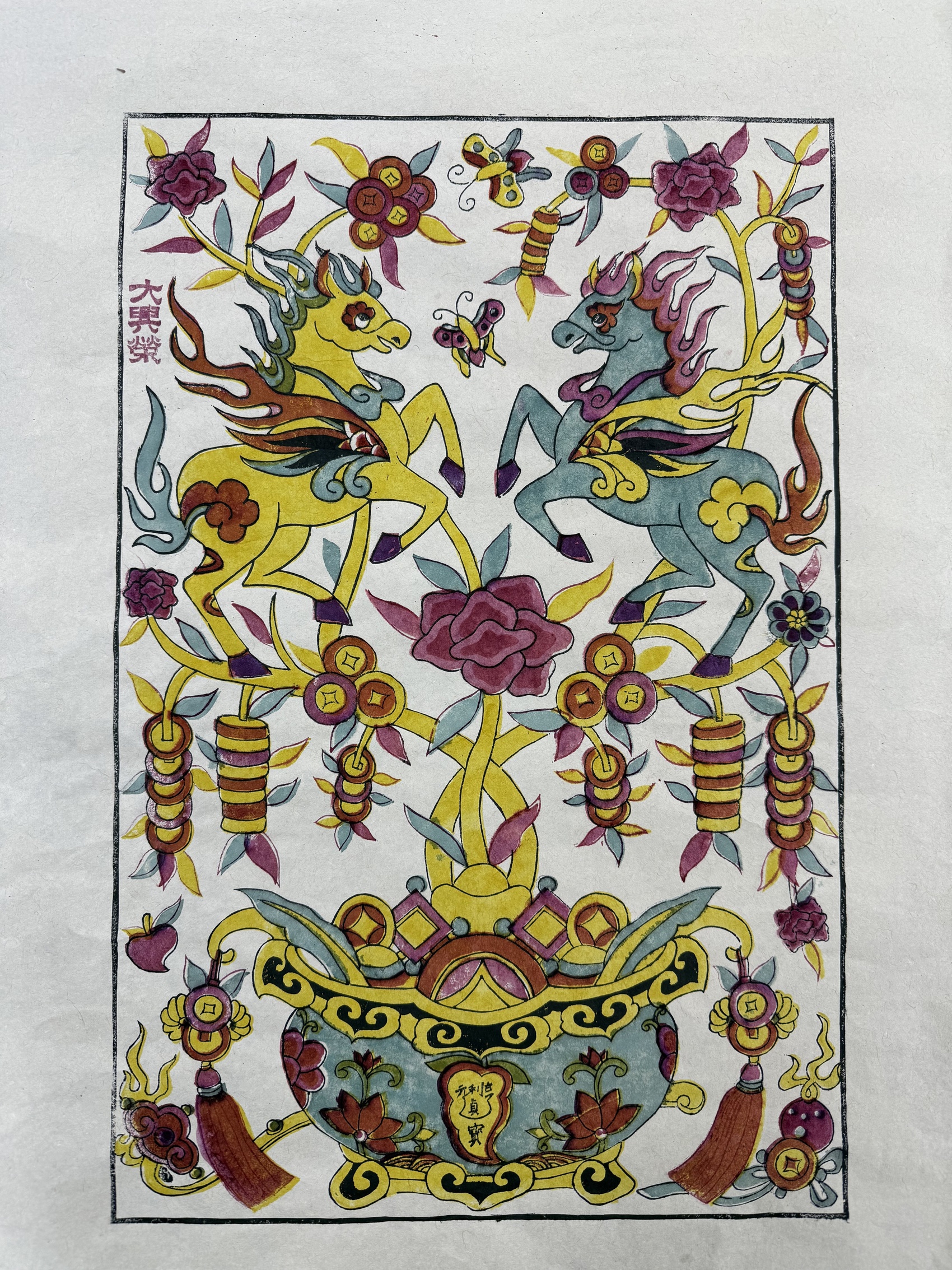 从夹江年画经典作品中吸取灵感,《马上发财》的设计方案很快成型:作品参考《福禄宫》,将《元亨利贞》原作中的大肚花瓶改成聚宝盆;《元亨利贞》中的牡丹、蝴蝶等元素,被用到画面中。《马上发财》的构图、色彩都与《元亨利贞》相近,张荣强希望延续这种风格,用传统年画的元素重新组合、设计,做成一个系列。