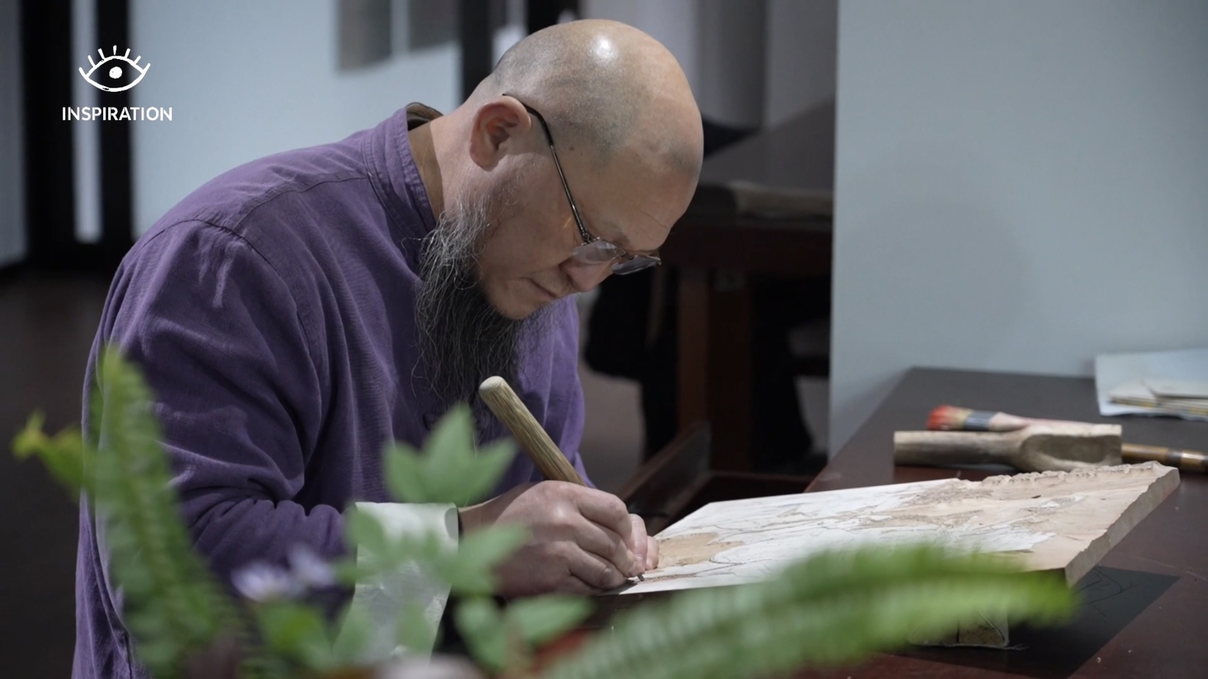 创作中的张荣强(夹江县融媒体中心 供图)