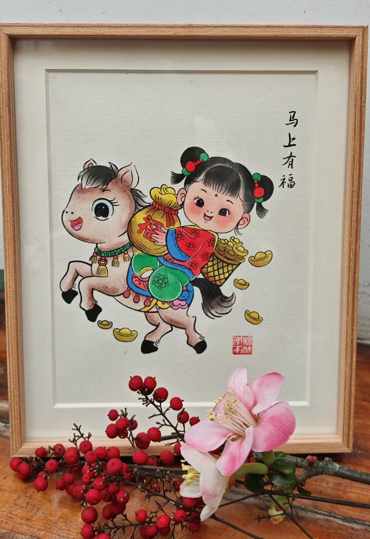 一匹身形矫健的骏马昂首奔腾,背上坐着憨态可掬的福娃,身前抱着福袋,身旁散落着金元宝——这幅名为《马上有福》的绵竹年画新作,由绵竹木版年画德阳市级代表性传承人贾君创作完成。作品以浓郁的“中国红”为主调,用萌趣的造型和明快的色彩,为丙午马年献上“即刻纳福、财运亨通”的美好祝福。