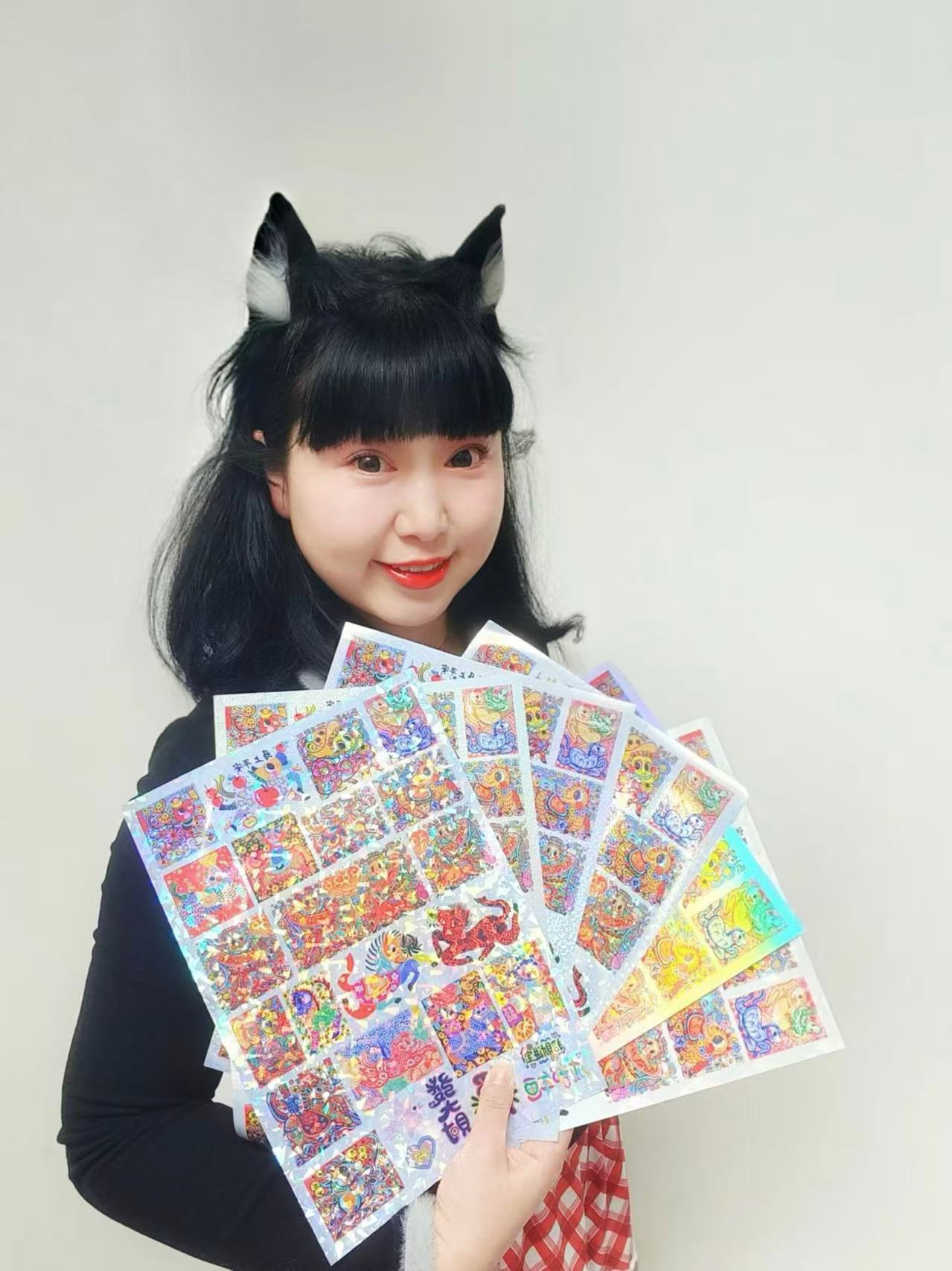 素面镭射、玻璃镭射、星星镭射、大点镭射……当记者第一眼看到孙博秀芳推出的马年年画文创贴纸产品的时候,最引人注目的就是其表面的彩虹反光效果。