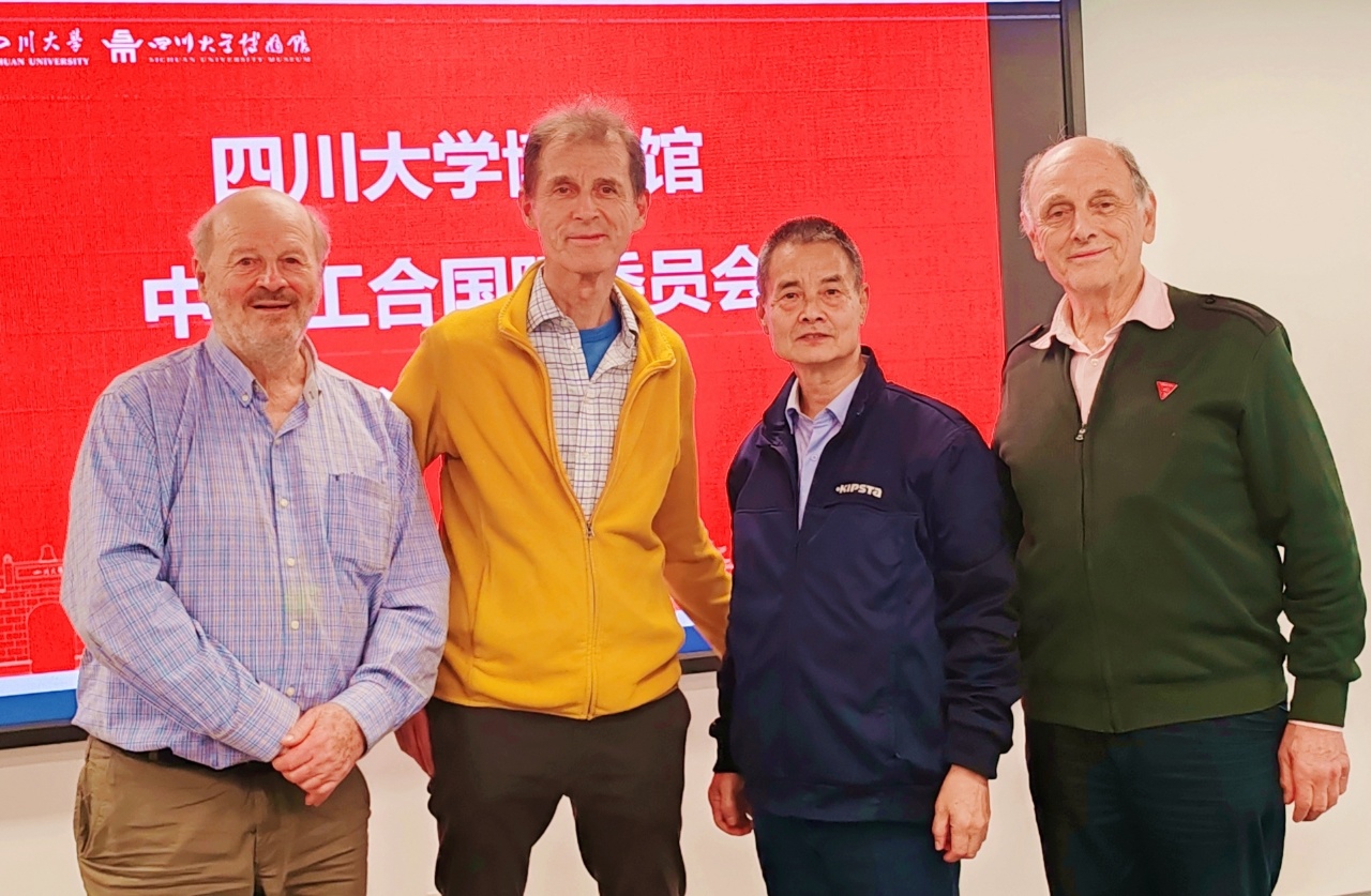 《尘封与重现》译注者王曙生(右二)与伊莎白长子柯鲁(左一)、次子柯马凯(右)、小儿子柯鸿冈合影(2025年,西南交通大学出版社 供图)