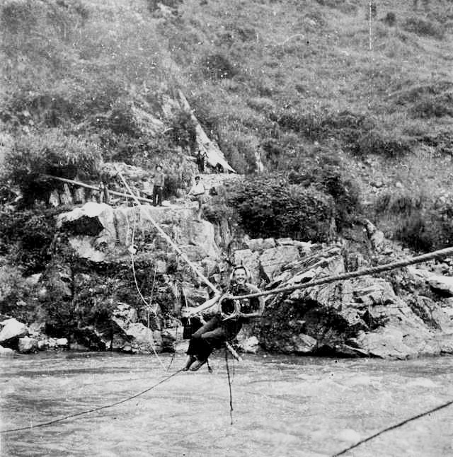 伊莎白过溜索(1939年,饶和美 摄,西南交通大学出版社 供图)
