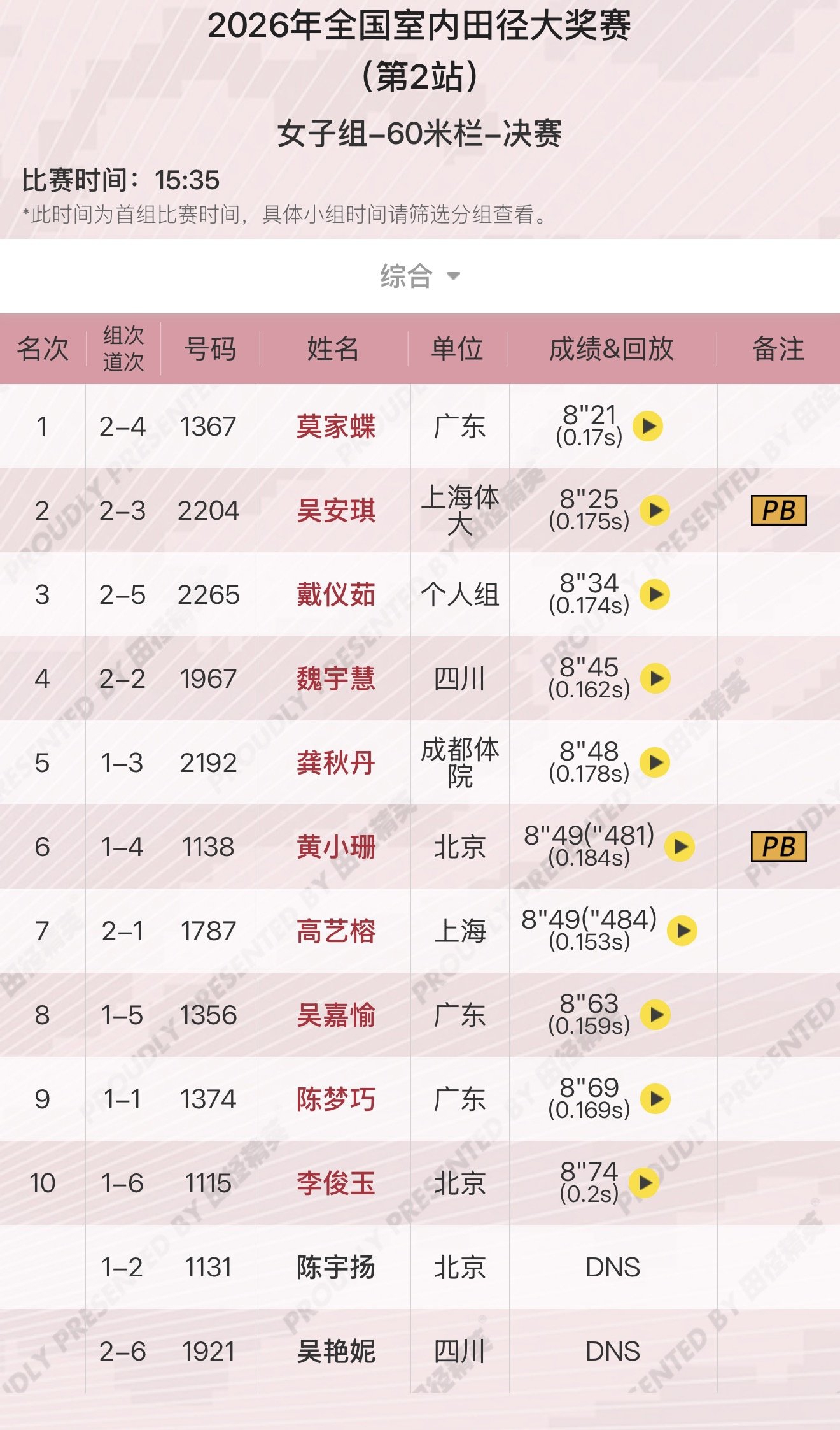 本次室内赛,原本是2026赛季吴艳妮的首秀。赛前,报名秩序册上因为有吴艳妮、新科全运会冠军刘景扬、400米栏冠军莫家蝶等名将而看点十足。去年11月的十五运会女子100米栏决赛,刘景扬以12秒81爆冷夺冠,吴艳妮12秒85屈居亚军。新赛季在室内60米栏亮相,刘景扬最终缺席,记者向裁判求证后得知,她并未参与本次比赛。