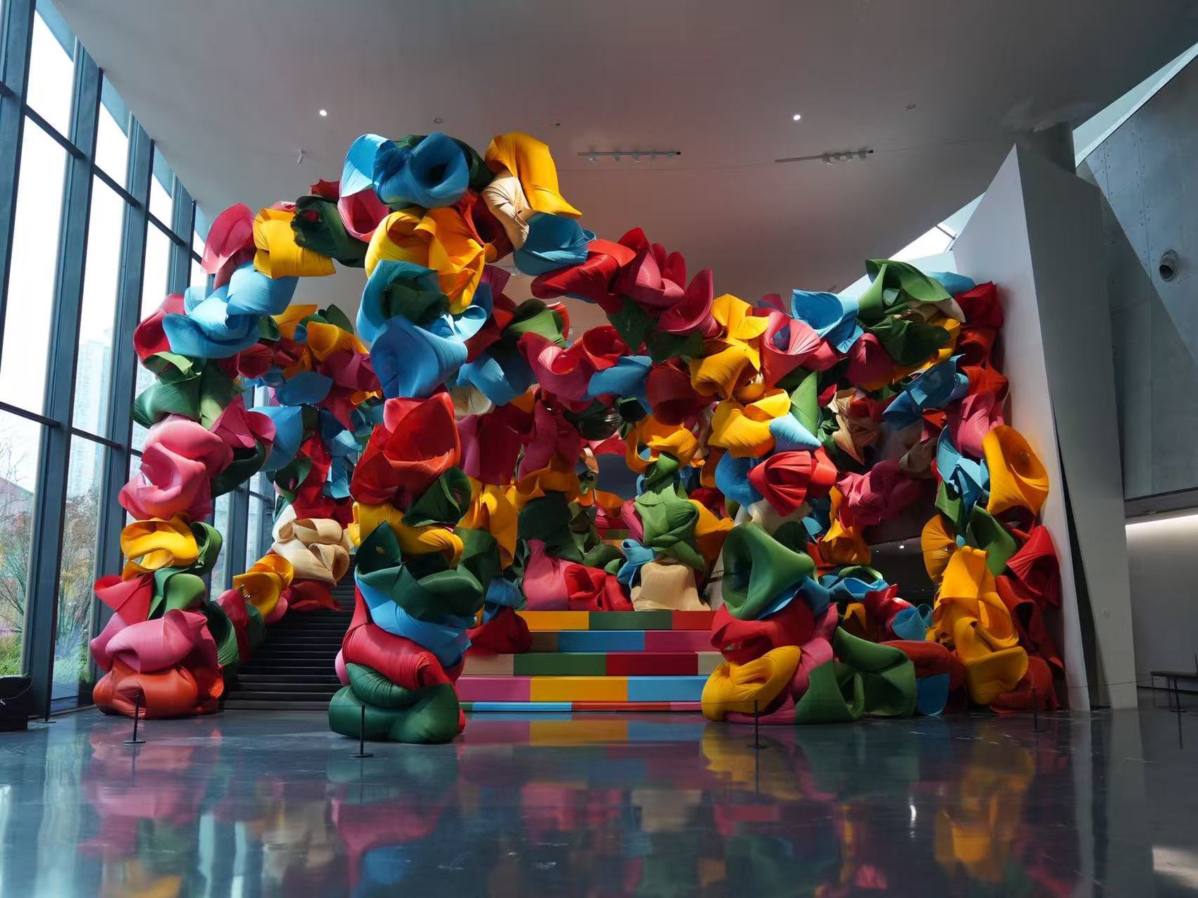 红的、粉的、绿的、黄的、蓝的,彩色竹材卷曲、连接、堆叠,从地面密密匝匝地延伸至10米高的空中……艺术家冯羽从杜甫的“两个黄鹂鸣翠柳,一行白鹭上青天”获得灵感,创作了这件大型空间艺术装置《鹂鹭七绝·歌唱》。