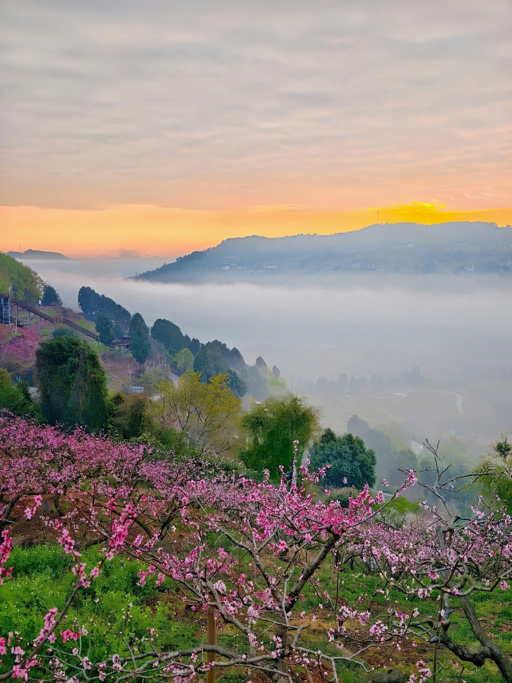 龙泉山桃花故里,日出东方时,平流雾与桃花相得益彰 来源:视觉四川 文增勇 摄