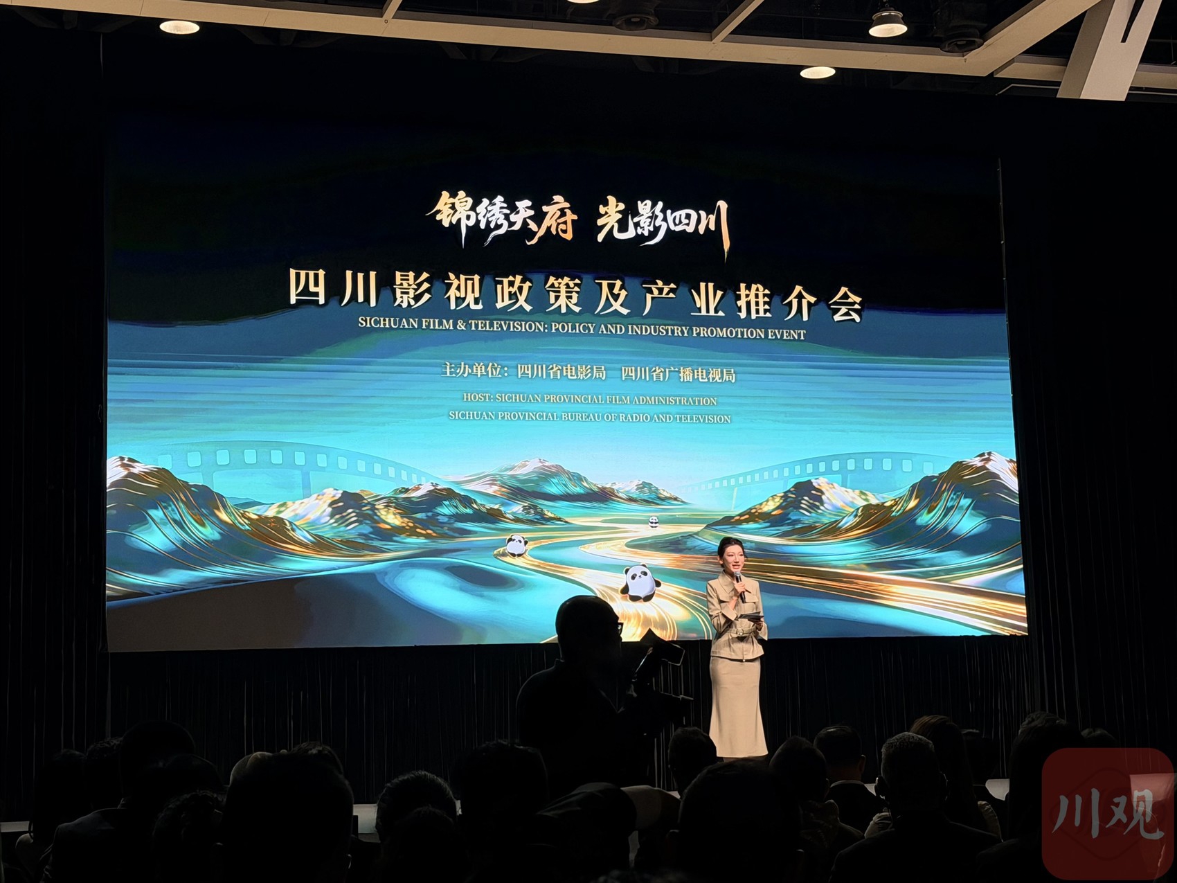 推介会在四川外宣片《绘锦绣 立上游》及川剧舞蹈《古蜀天边行》中拉开帷幕。现场,主办方对“四川造”影视项目、产业政策优势、金熊猫奖等内容进行了重点推介。