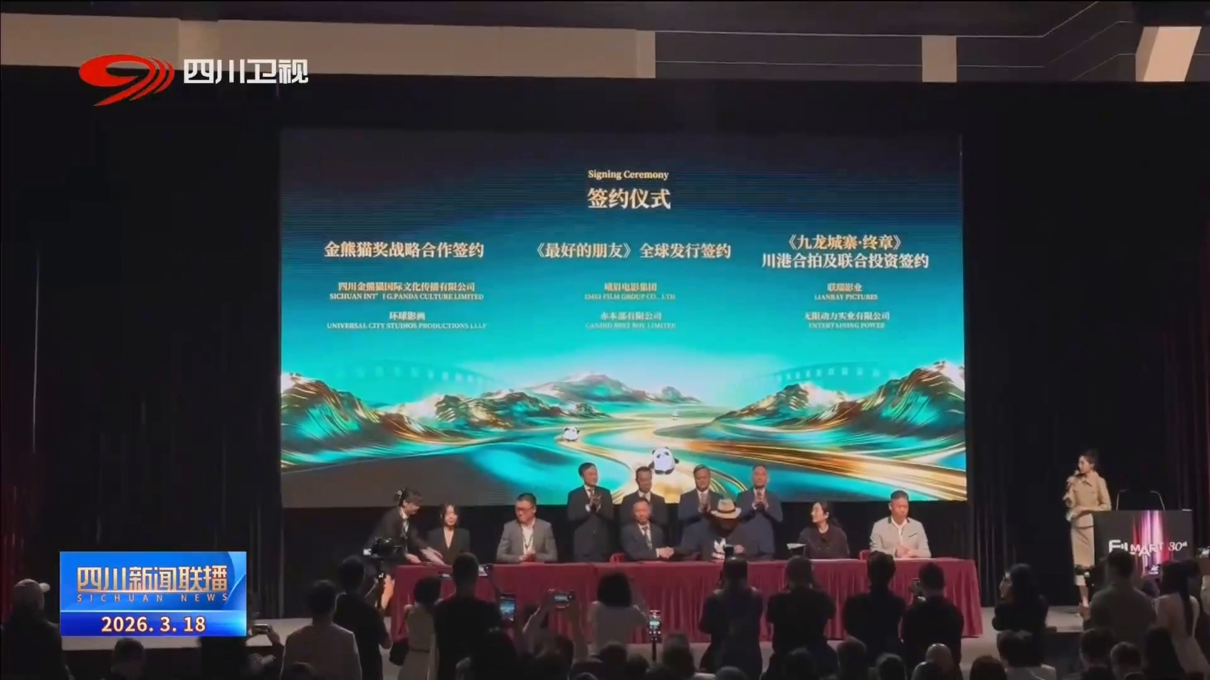 本次推介会的“重头戏”,当属六项具有代表性的合作协议在现场集中签署。签约项目包括电影《九龙城寨·终章》川港合拍及联合投资签约、金熊猫奖战略合作签约等。