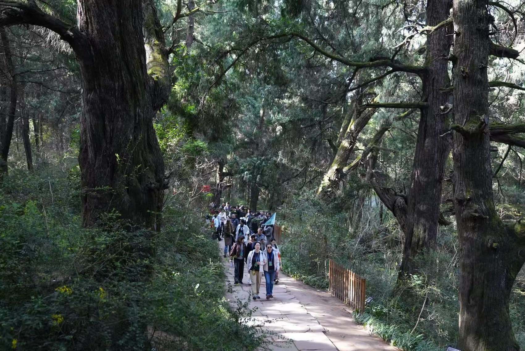 3月24日上午,“徒步千年蜀道 对话文明之路” 中美民间交流蜀道行活动首站抵达蜀道翠云廊。春日暖阳普照,古柏苍劲挺拔。有着 “衔空三百里,一色郁青苍” 美誉的翠云廊,顿时让到场的中美嘉宾直观领略到蜀道得天独厚的自然生态之美。漫步古道,伴着讲解员的娓娓讲述,大家聆听千年古柏的沧桑过往,了解张飞柏、阿斗柏等古树背后的人文故事,深切感受蜀道厚重鲜活的人文底蕴。