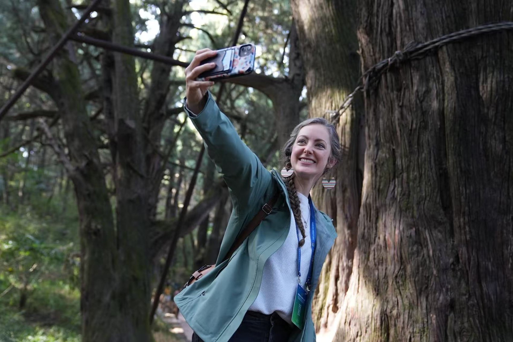 在“夫妻柏”前,已在中国工作了20多年的武汉长江外籍子女学校原副校长卡珊娣(音)和丈夫来了一个合影,“这个树的寓意非常美好。”她用手摸着古树,“触摸它们,就像触摸了一段历史。”卡珊娣非常欣慰能到蜀道走一走,“听说习主席曾视察过这里。他非常重视保护中国的历史文脉与生态环境,这种在发展中做好保护的理念令人敬佩。当我沐浴在蜀道清新的空气中,了解了中国人保护古树的故事,也就能理解为何这些古树能够保存至今。当然,它更帮助我理解今天的中国为何能够建设得如此美丽。”