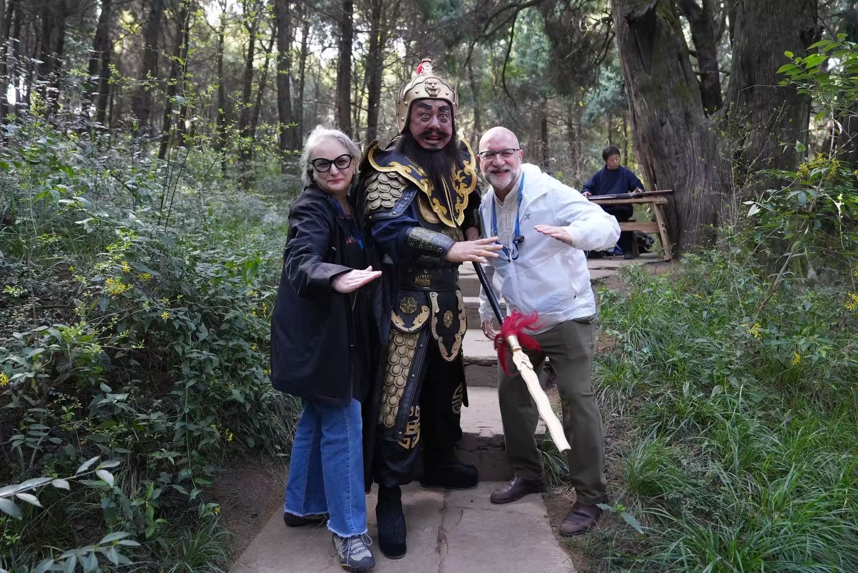 美国嘉宾在翠云廊和扮演张飞的演员合影