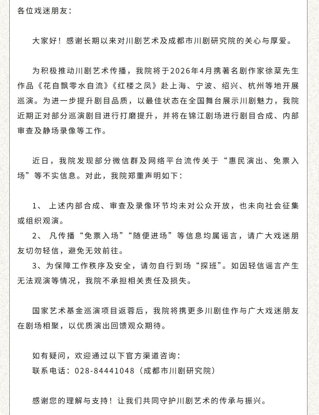 近期,部分微信群及网络平台流传上述剧目“惠民演出、免票入场”等不实信息。成都市川剧研究院表示,上述内部合成、审查及录像环节均未对公众开放,也未向社会征集或组织观演。凡传播“免票入场”“随便进场”等信息均属谣言,为保障工作秩序及安全,成都市川剧研究院提示戏迷请勿自行到场“探班”。