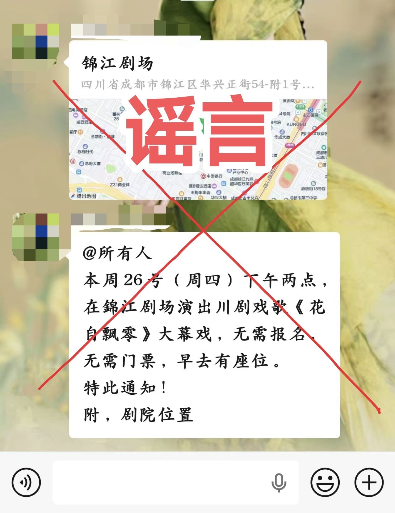 3月26日,成都市川剧研究院发布观演提示,辟谣近期网络流传“著名剧作家徐棻作品《花自飘零水自流》《红楼之凤》锦江剧场免费观演”谣言信息,提示戏迷不要轻信谣言,避免无效前往。