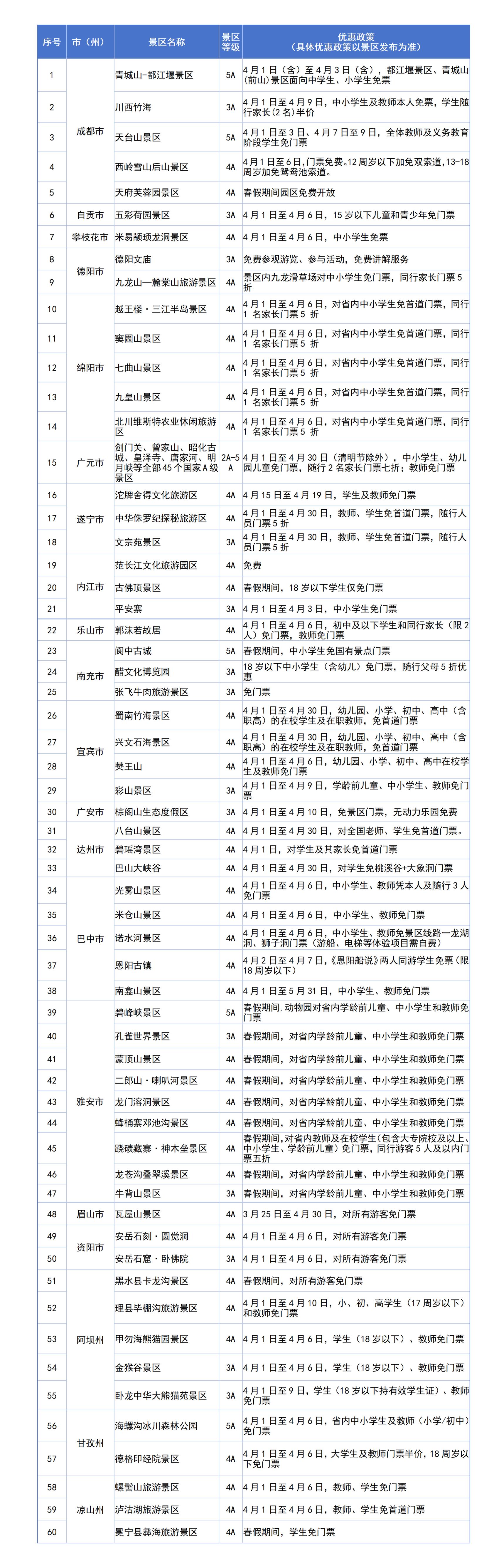 其中,广元全市45家A级景区于4月1日至4月30日(清明节假期除外)面向全国全日制中小学生、幼儿园儿童、在职教师免门票,每名学生(儿童)随行的2名家长(或法定监护人)也可享受门票7折优惠;青城山—都江堰、海螺沟冰川森林公园等景区,针对中小学生等特定群体实施免门票政策;瓦屋山景区、安岳石刻·圆觉洞、天府芙蓉园、黑水县卡龙沟等景区,面向所有游客免门票。除100多家景区免门票外,达古冰川、丹景台等部分景区也推出不同的门票优惠政策。