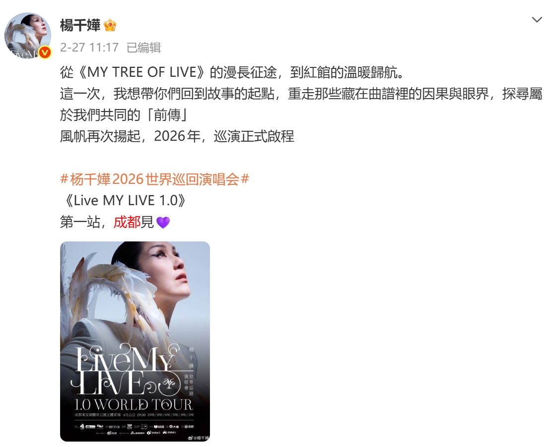 4月,省会成都作为西南地区演出布局重要城市,每个周末均有知名艺人演唱会定档。 从“港乐天后”、实力唱作人到国际摇滚乐队,多场演唱会已官宣,覆盖流行、摇滚、怀旧等多元风格。