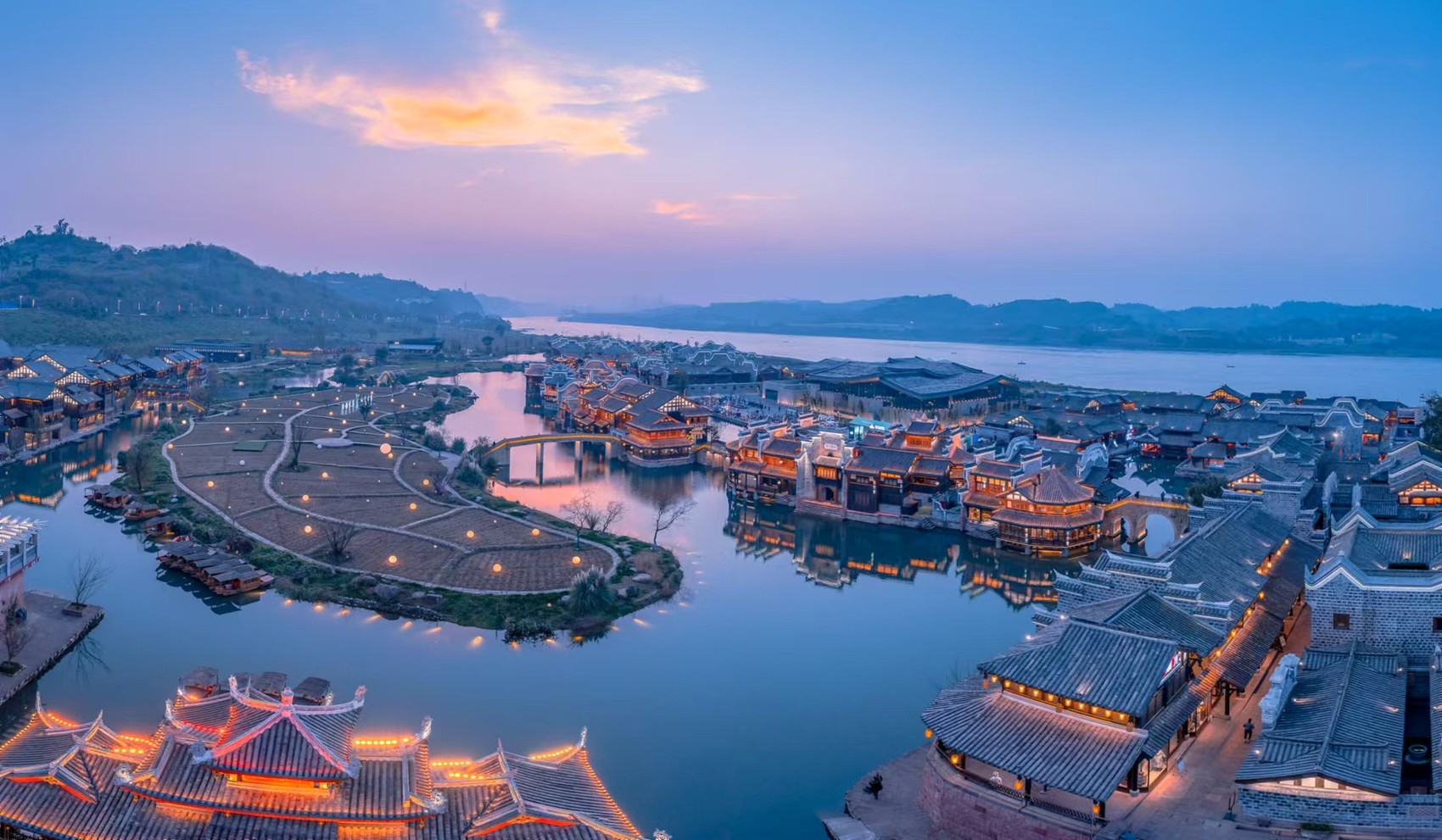 李庄古镇月亮田:位于宜宾翠屏区,60亩水街贯穿其中,86栋仿古建筑飞檐翘角、拔地而起,亭台楼榭、小桥流水相得益彰,开展非遗演艺舞草龙、水调歌头·水上情景舞蹈、繁华盛焰·水上川剧火艺、山高水长·凤凰飞行表演、月湖雅韵·水上民乐演艺等特色活动。