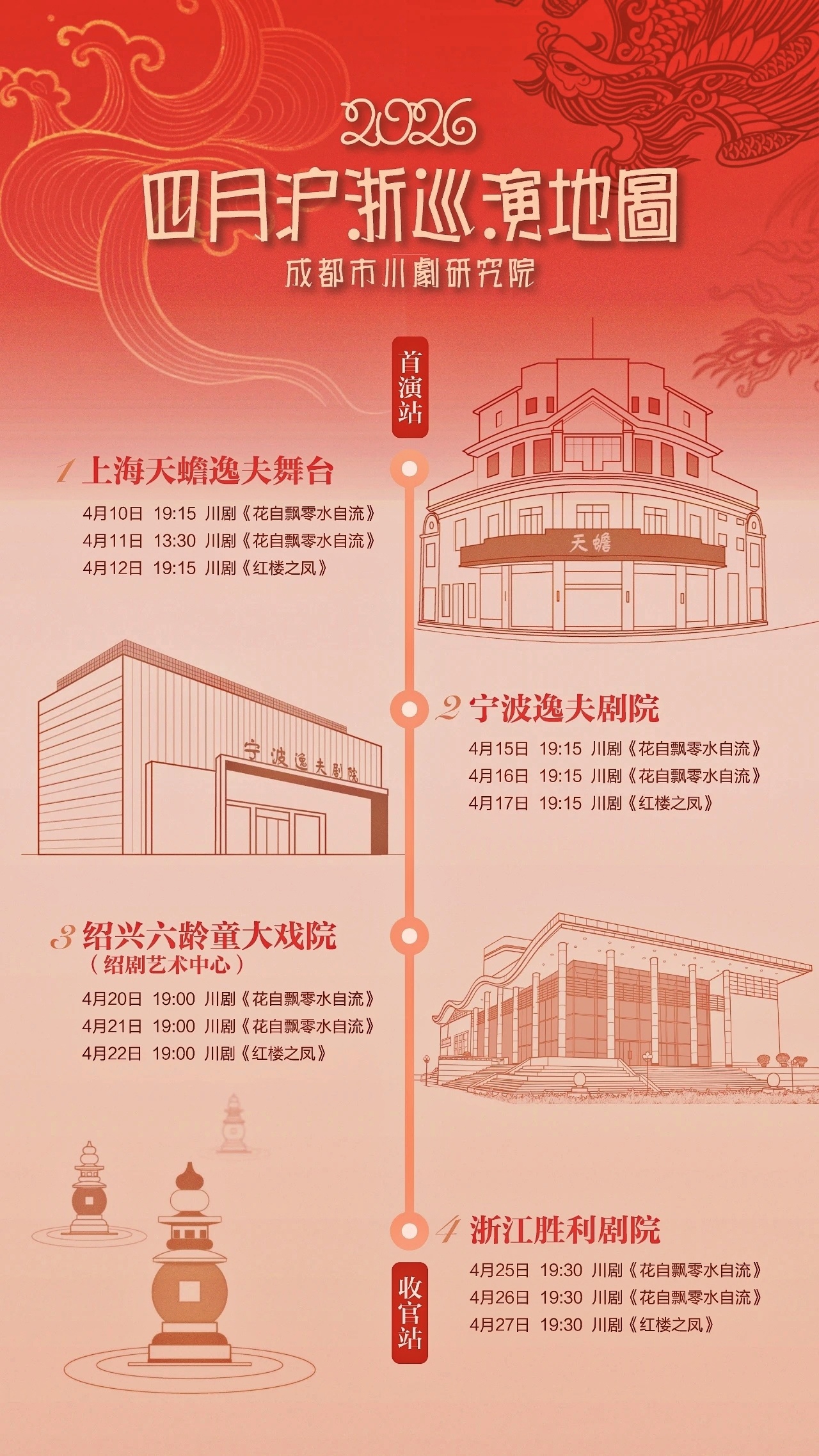 每一巡演城市共计3场演出,前两场次为《花自飘零水自流》,后一场为《红楼之凤》,以12场演出的高密度巡演,奏响蜀地与吴越的跨城和鸣。两部戏都为近年来的新编川剧代表作,也都是徐棻编剧、陈巧茹主演的合力作品。