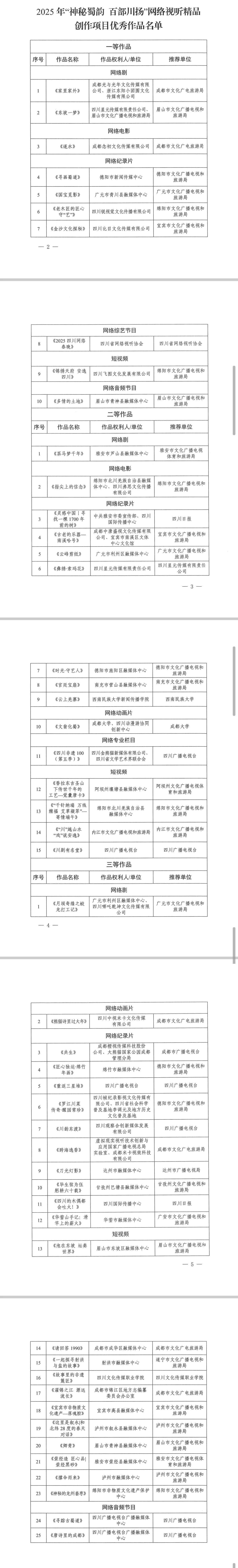 据悉,2025年“百部川扬”网络视听作品征集传播活动,累计征集原创作品3710部(期)。“神秘蜀韵 百部川扬”网络视听精品创作活动,共收到申报作品510部(期),评选优秀作品50部,两项活动通过海内外多平台联动传播,全网总流量突破百亿,有力推动了四川省网络视听内容建设与文化繁荣发展。